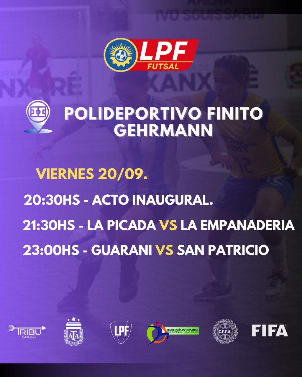 La jornada del viernes comenzará con el acto inaugural a las 20:30 con representantes del departamento de futsal y las jugadoras de los los equipos participantes. Seguidamente a las 21:30 se llevará a cabo el primer partido, La Picada vs La Empanaderia y a las 23:00hs Guaraní se medirá ante San Patricio.