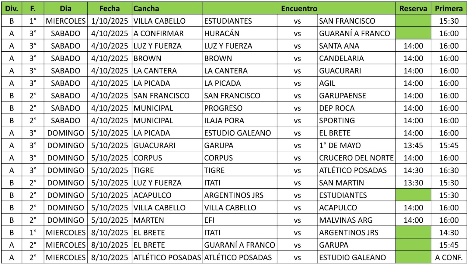 Cabe mencionar que se programaron encuentros pendientes por la 2° fecha para el miércoles 8 de octubre. Guaraní Antonio Franco recibirá a Garupá, en tanto que Atlético Posadas será local ante Estudio Galeano.