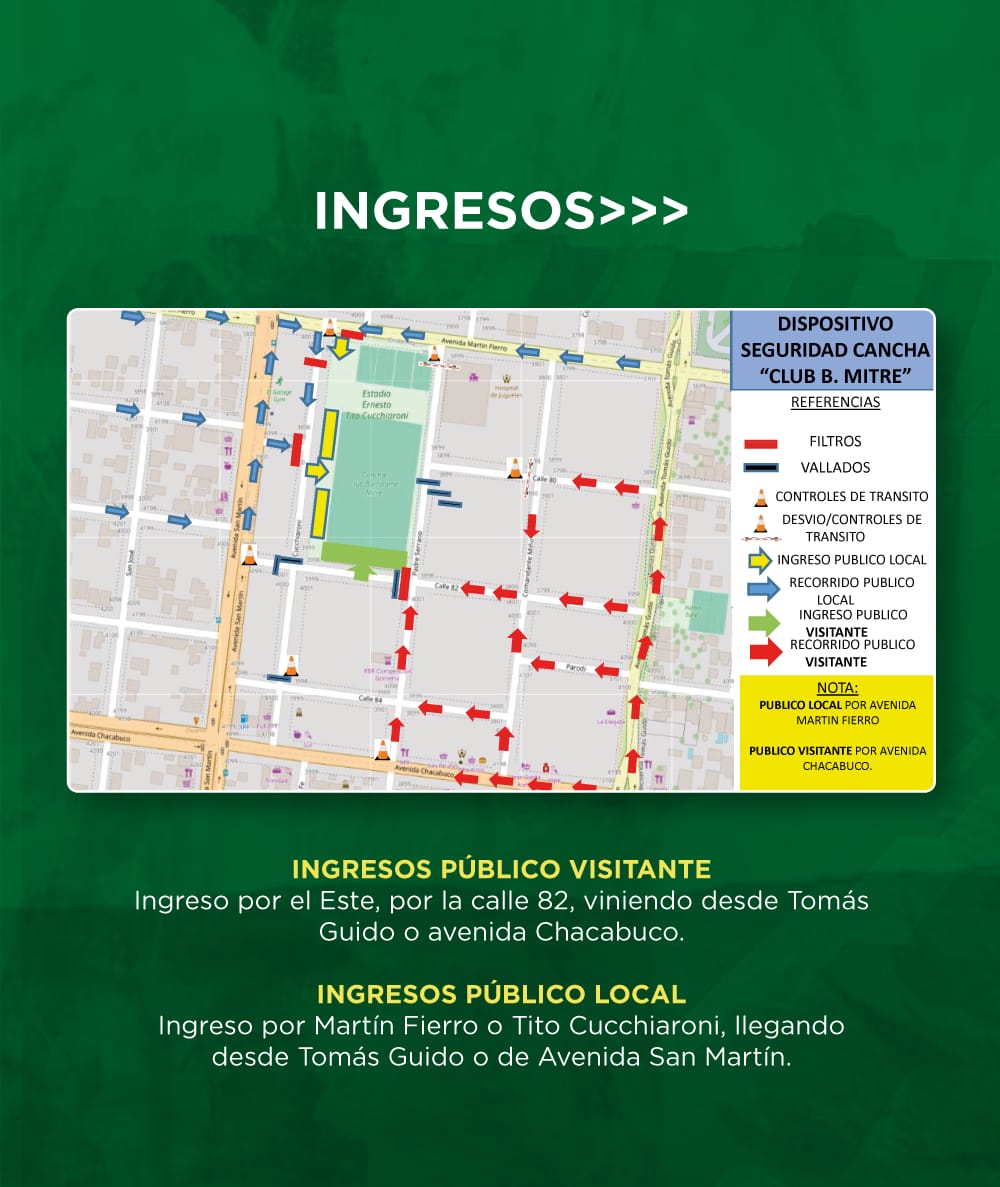 La parcialidad de Guaraní deberá llegar desde el Este, por la calle 82, viniendo desde Tomás Guido o avenida Chacabuco ; mientras que los hinchas de Mitre ingresarán por Martín Fierro o Tito Cucchiaroni, llegando desde Tomás Guido o de Avenida San Martín (ver croquis).