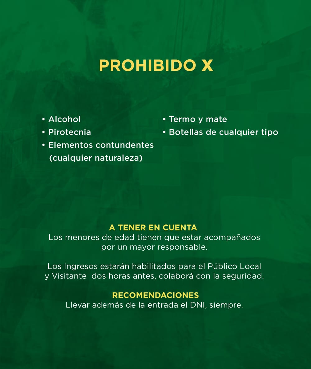 PROHIBIDO: Bebidas alcohólicas, pirotecnia, termo y mate, botellas de cualquier tipo y elementos contundentes (de cualquier naturaleza).