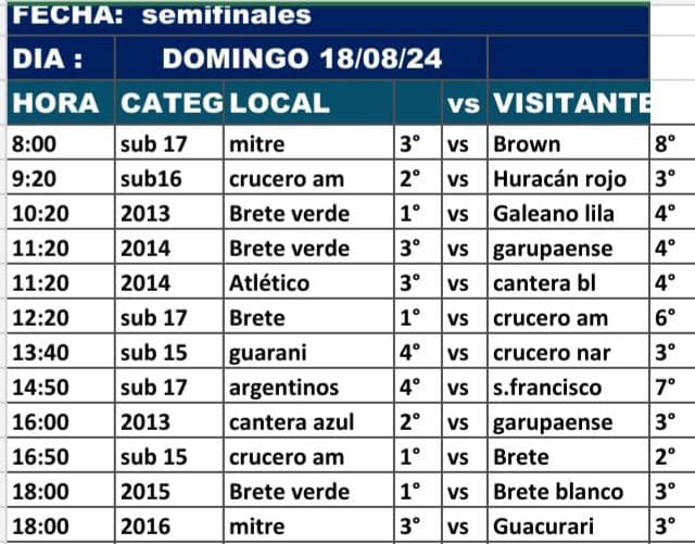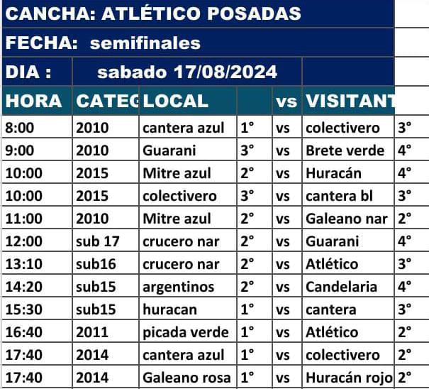 Mientras que el domingo, también todos los partidos se jugarán en la cancha de Atlético Posadas, desde las 08:00hs la categoría Sub 17 de Mitre se enfrentará a Brown y el último partido programado es entre la categoría 2016 de Mitre y Guacurarí desde las 18:00hs.