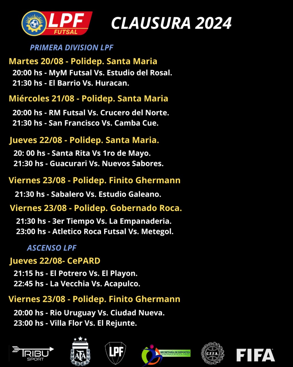 Esta noche, con dos partidos, se pondrá en marcha la segunda fecha del Torneo Clausura 2024 de la Liga Posadeña de Futsal (LPF), bajo organización del Departamento de Futsal de la Liga Posadeña de Fútbol.