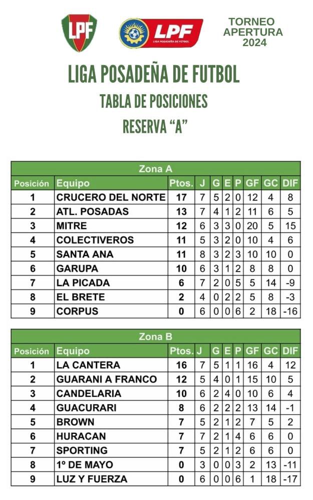 La Tabla de Posiciones en Primera y Reserva está de la siguiente manera: