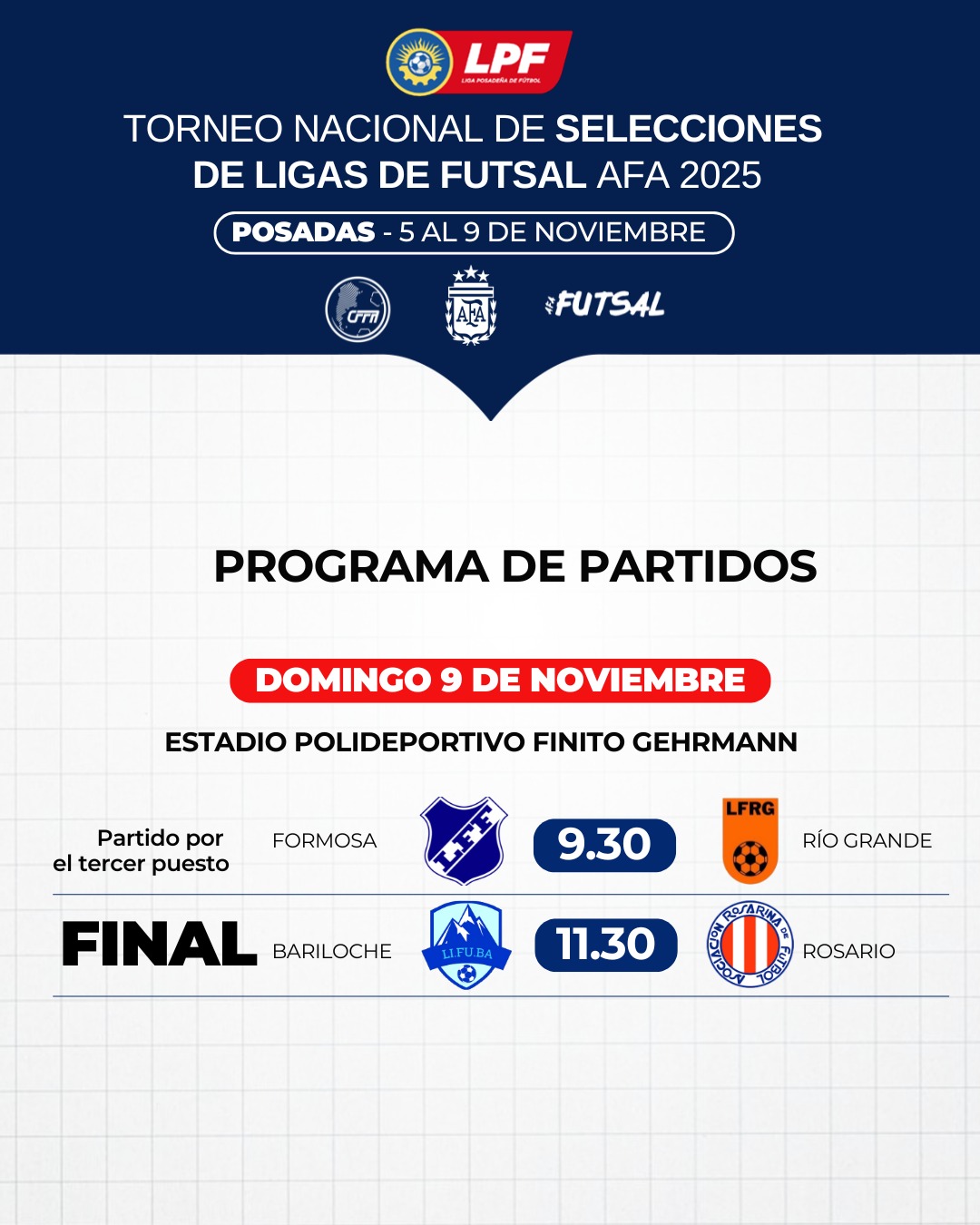 De esta manera la gran definición será este domingo en el cual se medirán a partir de las 11:30 horas. Cabe mencionar que el encuentro por el 3er y 4to puesto será entre Formosa y Río Grande será a partir de las 9:30.