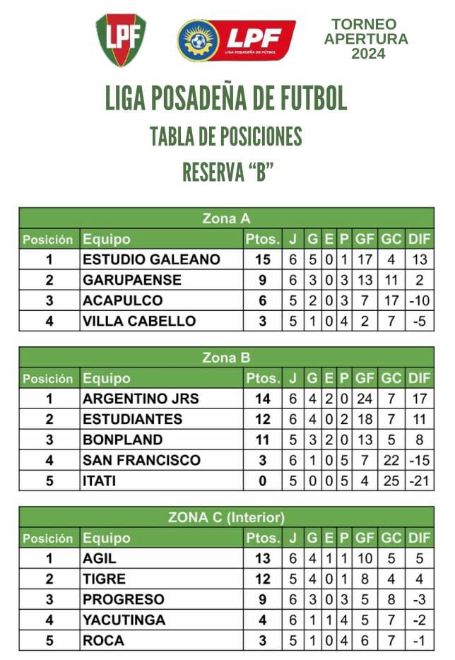 La Tabla de Posiciones en Primera y Reserva está de la siguiente manera: