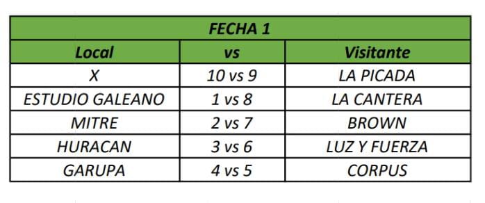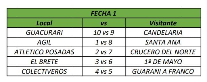 🔹 Zona A: Bartolomé Mitre, Jorge Gibson Brown, Atlético Huracán, Deportivo Corpus, La Picada, La Cantera, Luz y Fuerza, Estudio Galeano, Garupá FC y Tigre o Argentinos Juniors.
